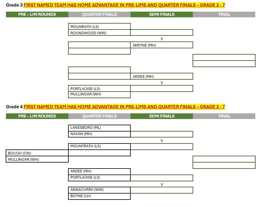 Important Late Changes – Grade 3 Moved to Baldoyle, 10am start and top two teams from each group advance. Baltinglass venue no longer in play.