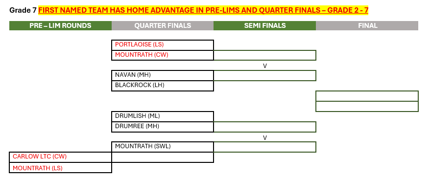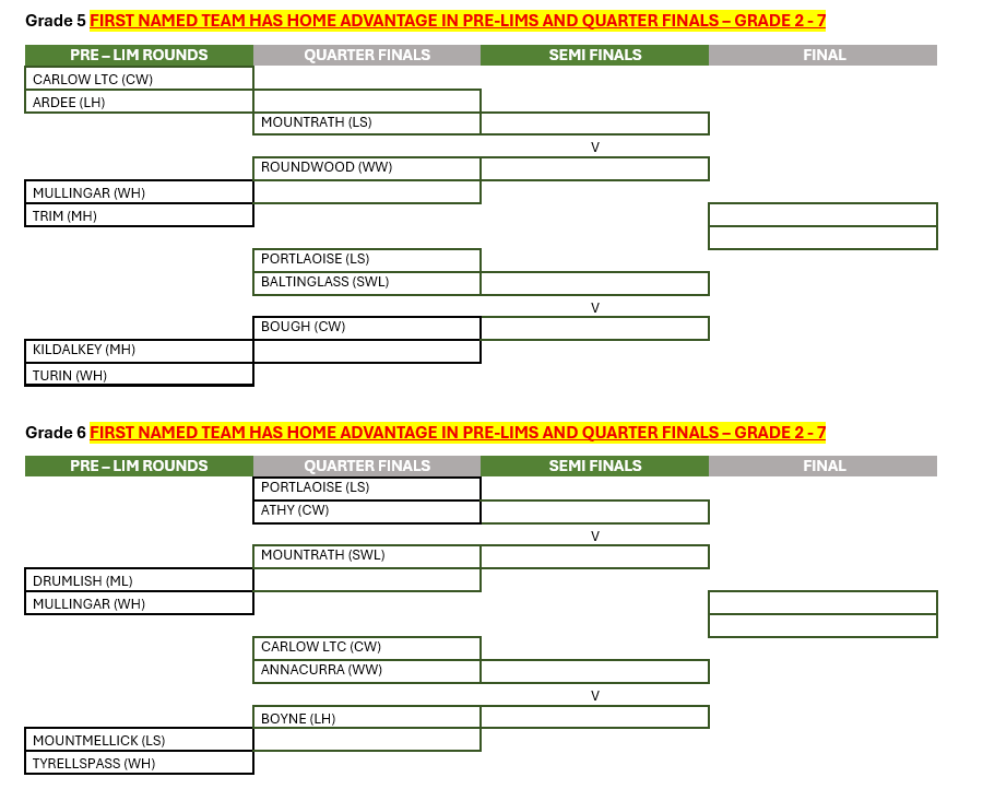 Inter County Semi-finals & Finals Schedule. Sunday 23rd March 2025. Grade 4 semi-finals to be played at Marino Institute of Education: https://maps.app.goo.gl/Rpzmk7Q8HGdnzund8, all other grades to be played in Baldoyle. ALL Finals will be played in Baldoyle in the afternoon.