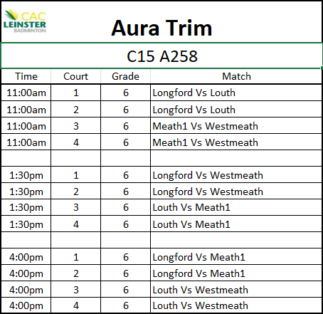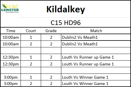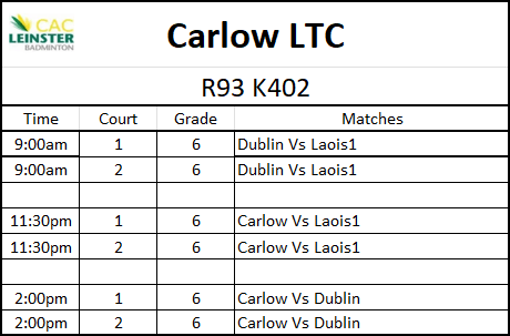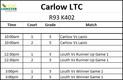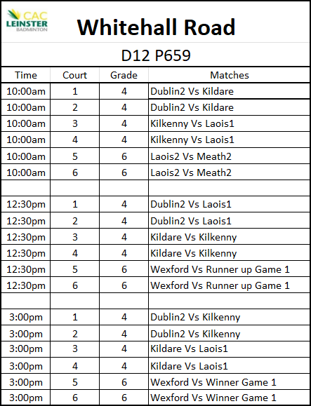 Here are the locations and times for Grades 2, 4 & 6. Please ensure that you note your correct team number for your grade, Eircodes for your hall and start times as they vary per location. Get there 30 minutes before the draw. Grade 6 teams that are playing in Carlow should note that there are 2 different venues and you will have to move from one venue to the other throughout the day. It is very important that warmups take no longer than 3 minutes.